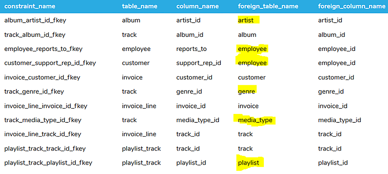 Now, let's say that we want to insert records into both the parent and child tables. The order in which these insert operations occur is important. We must begin by inserting records into the tables that do NOT have foreign keys to other tables. If we look at the set of table constraints, we can see that those tables are artist, genre, media_type, playlist, and employee, as shown below. These are the tables that are not referenced in any of the constraints in the first column.