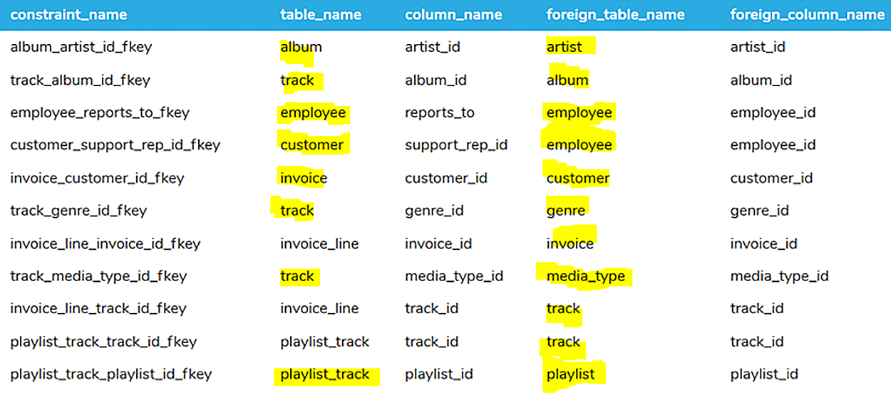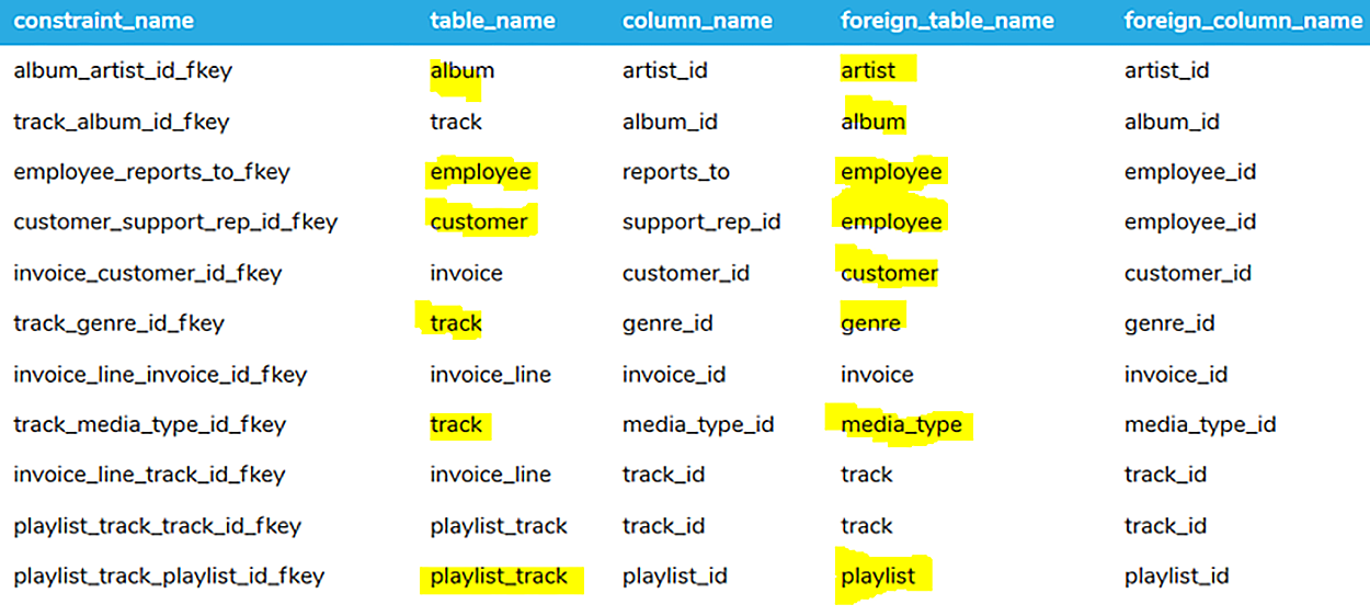 The second and third columns contain the information about the child table with a foreign key. The fourth and fifth columns show information about the parent table and the primary key that the child is referencing.