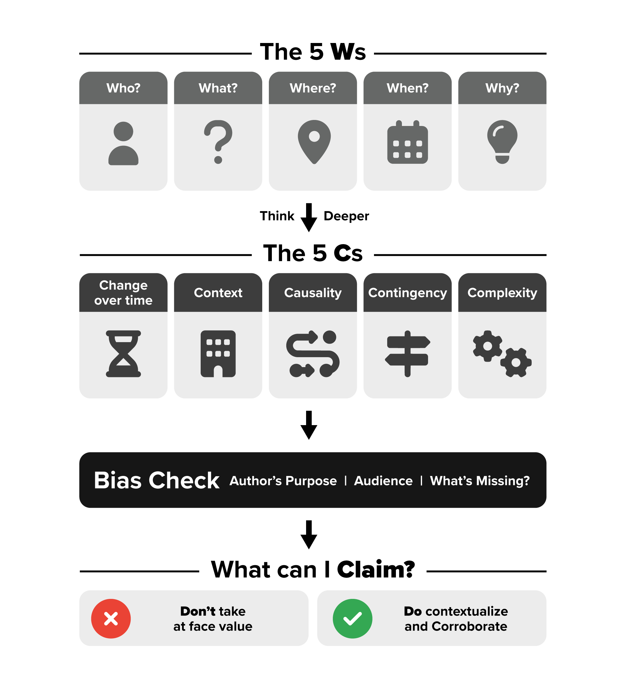 One way that historians do this is by thinking historically about an event and its related primary sources. This can be accomplished through a variety of intellectual channels, but an easy one to remember is to think in terms of the five Cs, seen in the following list (Andrews & Burke, 2007).