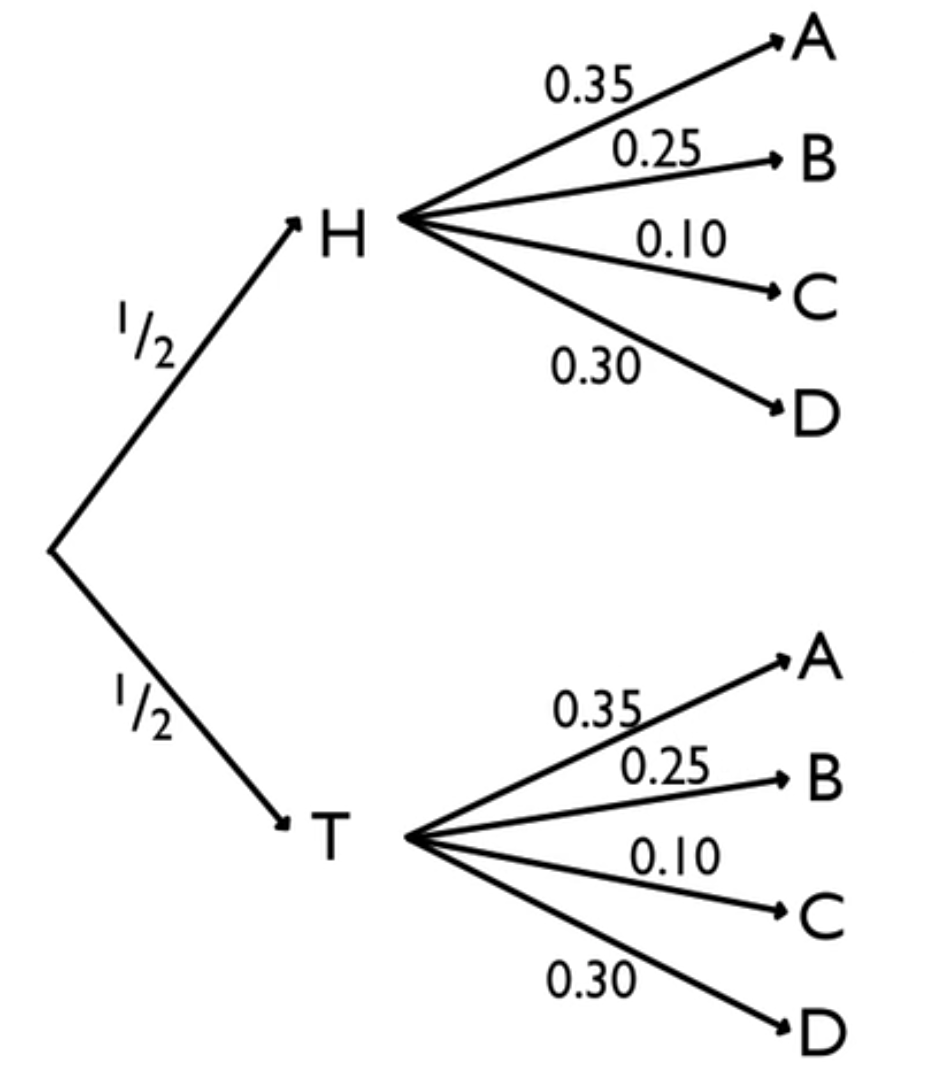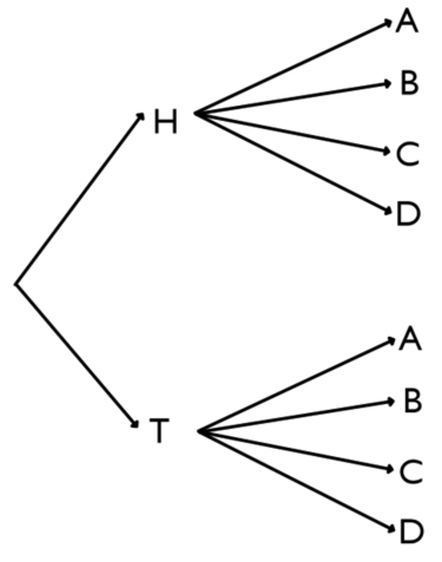 Suppose a coin is flipped and this spinner is spun, where A and D are a lot more common than B or C.