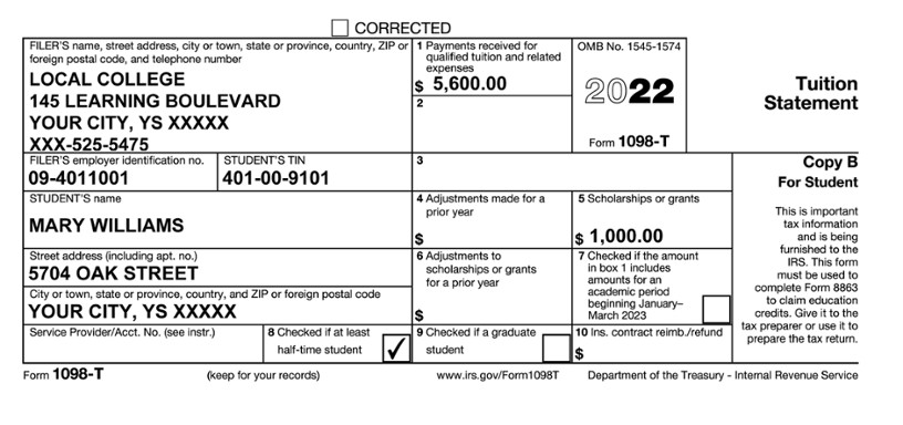 Mary received a Form 1098-T from Local College. Mary’s tuition expenses of $5,600 meet all of the qualifications for the AOTC. Mary also received a $1,000 grant. In addition to the expenses reported on Form 1098-T, Mary spent $712 on all of her textbooks, including one book ($100) required as a condition of enrollment and three other books ($612) not required as a condition of enrollment. She purchased them through an online book retailer and the school. Mary’s AGI (and MAGI) is $39,000 (all from wages). She had $3,200 federal income tax withheld. Mary’s Form 1098-T is shown below.