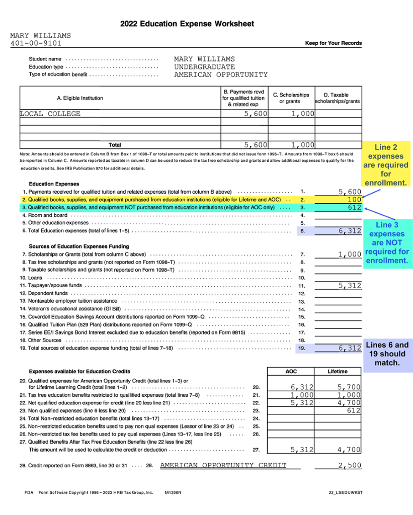 One item to note is the lines 2 and 3 amounts under “Education Expenses.” Line 2 includes qualified books, supplies, and equipment purchased as a requirement of enrollment. This makes the expenses qualified for the AOTC and the lifetime learning credit.