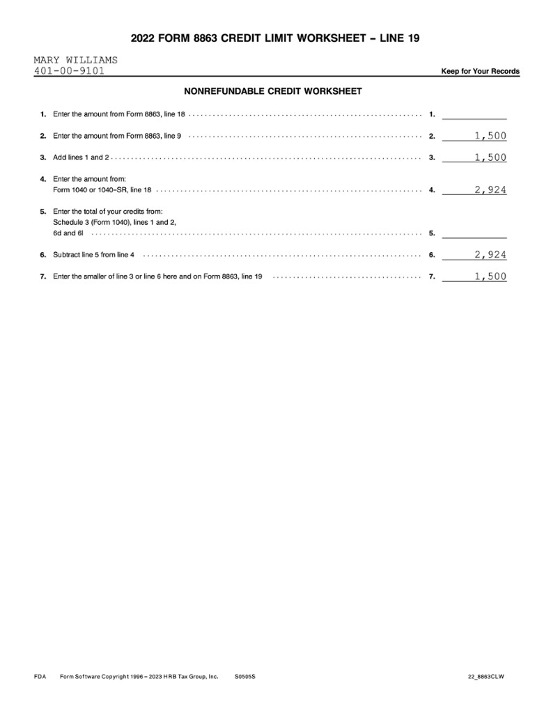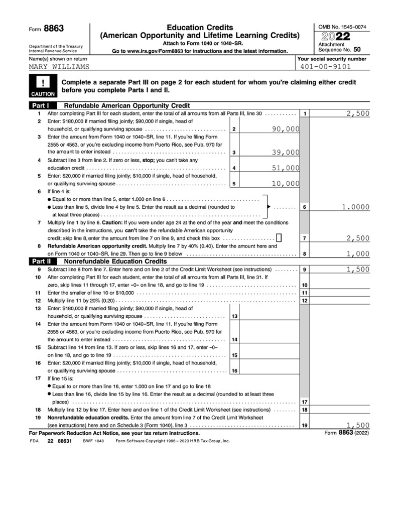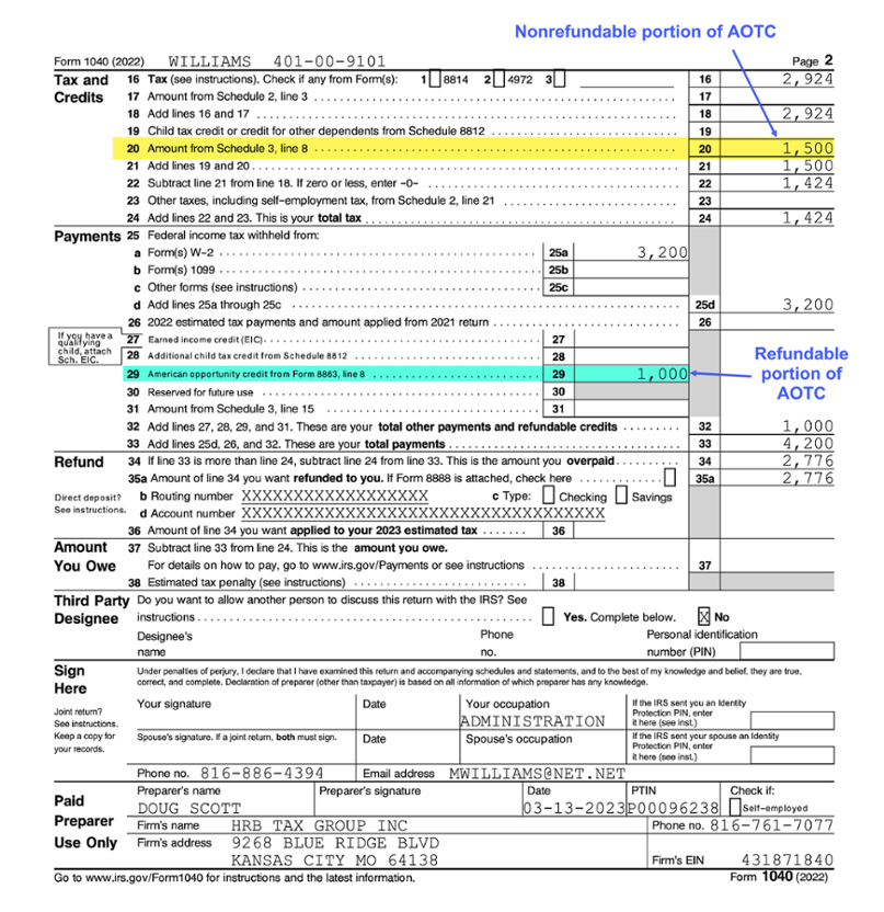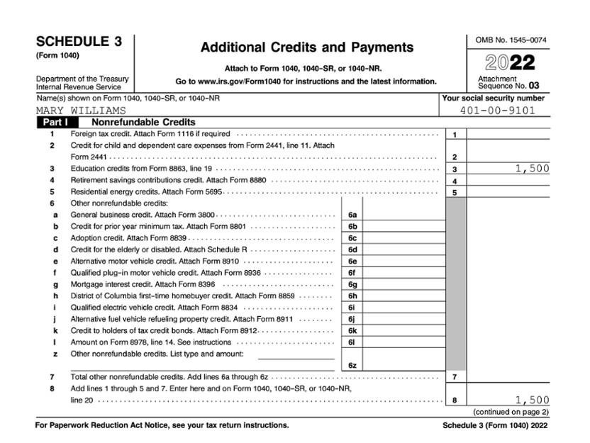 Mary qualifies for AOTC of $2,500, which is claimed on Form 8863 (shown below). Of her $2,500 AOTC, $1,500 is nonrefundable and $1,000 is refundable. Mary reports the $1,500 nonrefundable AOTC on Schedule 3, which then carries to Form 1040, line 20. She will report the $1,000 refundable AOTC on her Form 1040, line 29.