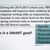 Let's look at a sample SMART goal. During the 2014-15 school year, 90% of students will improve their evidence based response writing skills as measured by an increase in one rubric level on the district spring common task as measured against the fall district baseline.