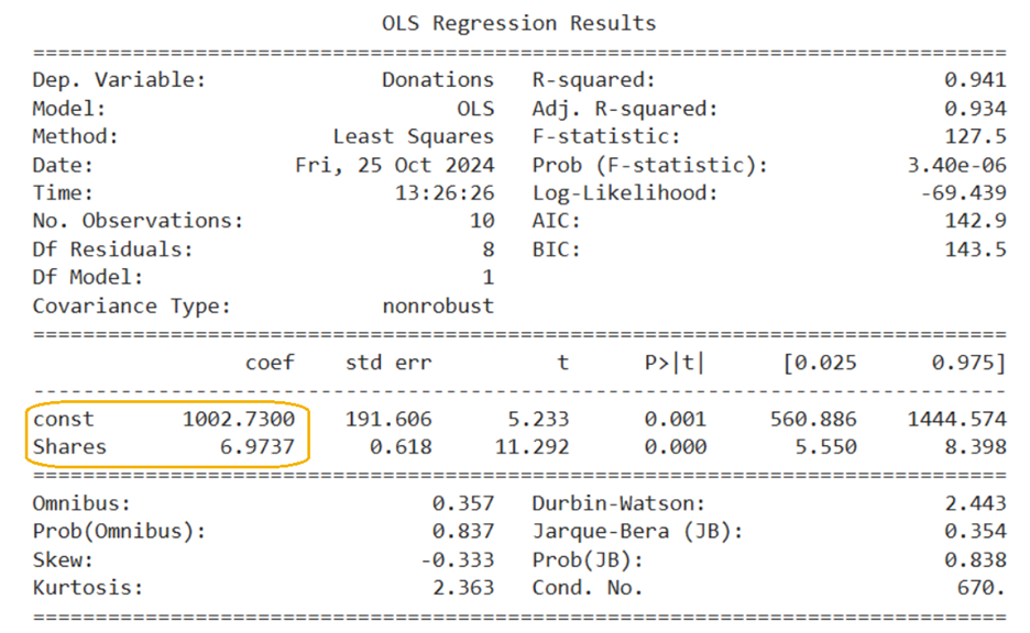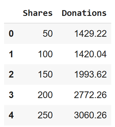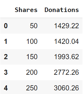 Now, let’s revisit how we built a simple linear regression model using Python for the amount of donations the non-profit will receive based on the number of social media shares a campaign receives.