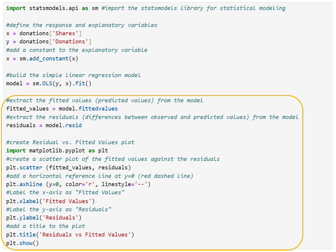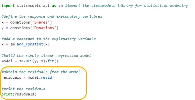 The code below builds a simple linear regression analysis using the statsmodels library. It defines the explanatory variable (number of shares) and the response variable (amount of donations) from a DataFrame, adds a constant to include an intercept, and builds the regression model using the Ordinary Least Squares (OLS) method. In addition, the new code circled obtains the residuals for each observation using Python and prints them on the screen.