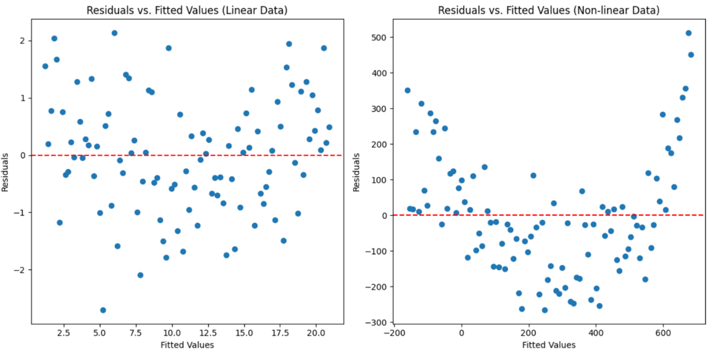 The plot on the right (Residuals vs. Fitted Values (Non-linear Data)) shows residuals from a non-linear relationship. The residuals form a clear pattern, suggesting that the linear model is not capturing the true relationship between the variables. In the non-linear data plot, the curved pattern of the residuals indicates that the relationship between the predictor and response variable is not linear.