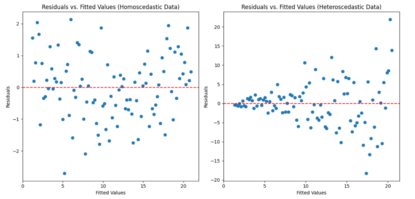 The plot on the right shows residuals from data with changing variance (heteroscedasticity). The residuals form a funnel shape, where the spread of the residuals increases with the fitted values, indicating that the model’s residuals are not consistent.