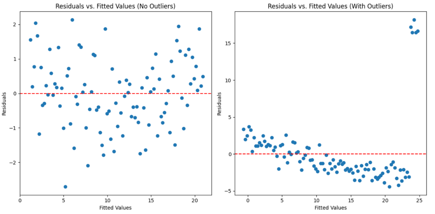 - If the residuals vs. fitted values plot shows points that are far from the horizontal axis (zero line), it suggests that these points are outliers. Outliers can have a significant impact on the regression model, potentially skewing the results and leading to inaccurate predictions.