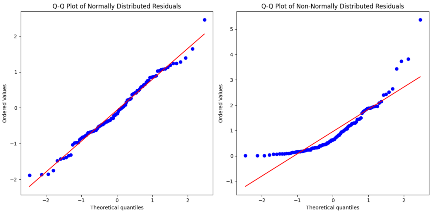 The plot on the right shows the Q-Q plot for non-normally distributed residuals. The points deviate significantly from the straight line, indicating that the residuals are not normally distributed.