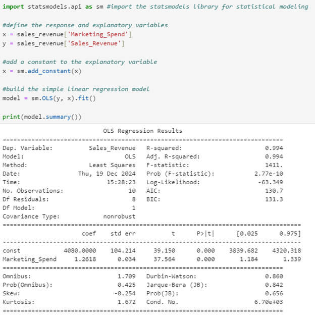 2. The code below will build the simple linear model, where Sales_Revenue is the response variable and Marketing_Spend is the explanatory variable.