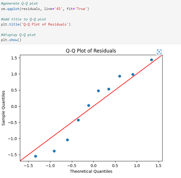 Now that you have examined the residuals vs. fitted values plot to assess non-linearity, constant variance, and outliers, let’s move on to creating a Q-Q plot to further evaluate the normality of the residuals.