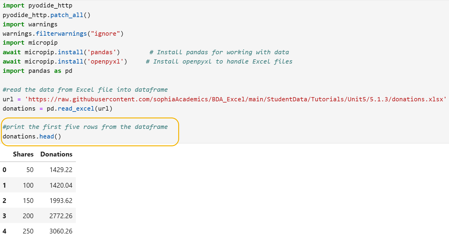 This code below imports the pandas Python library, reads the Excel file from a URL, creates a pandas DataFrame named donations, and allows you to view the first five rows of the donations DataFrame.