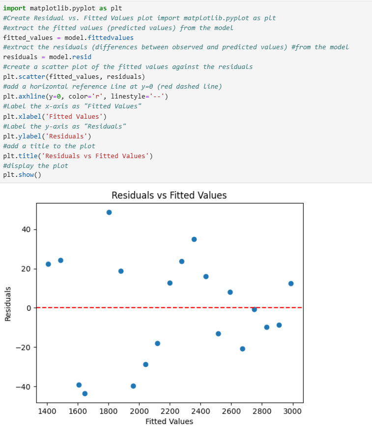 Explanation: Each point on the plot represents a fitted value and its corresponding residual. This helps visualize the relationship between the fitted values and the residuals.