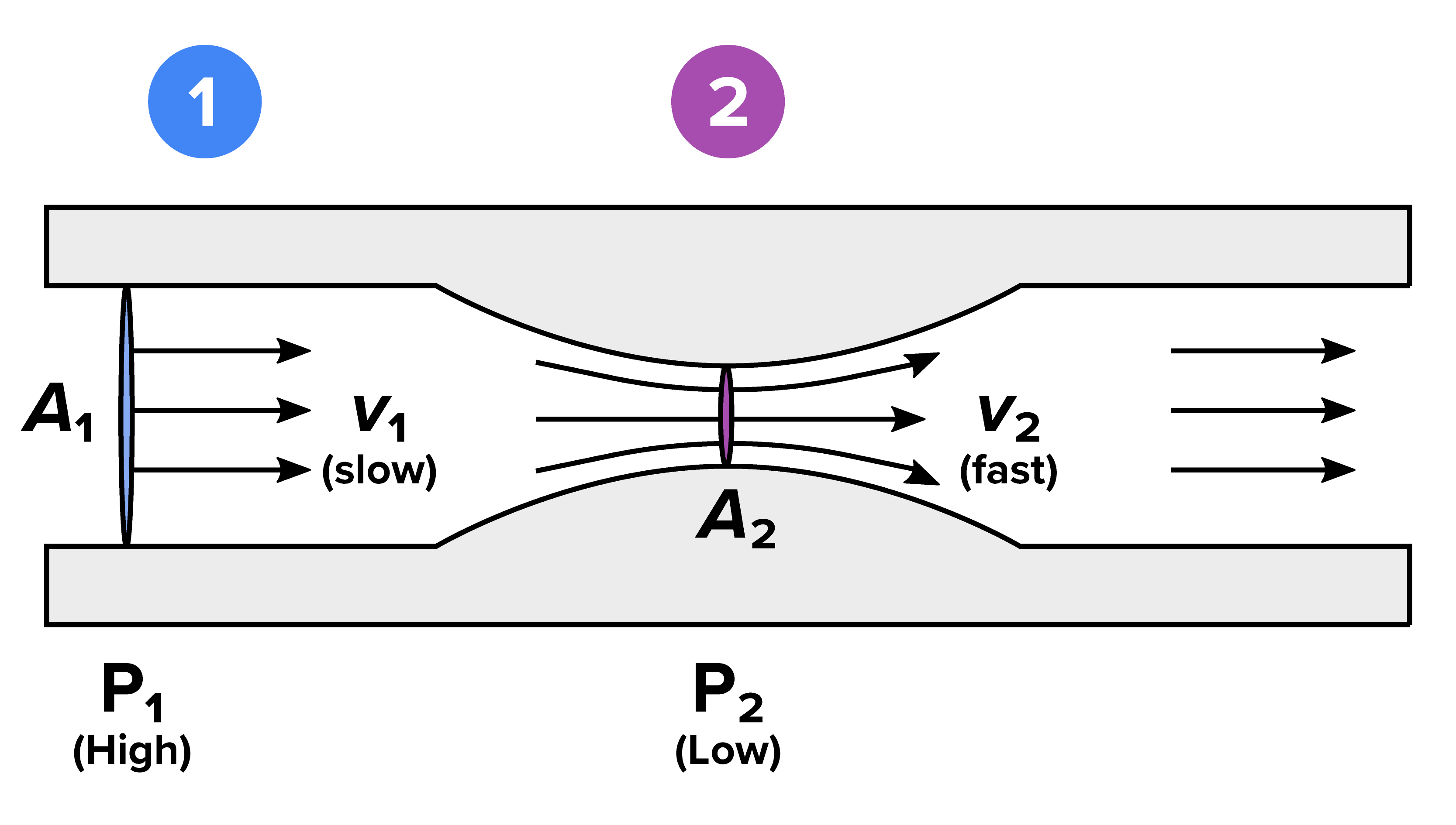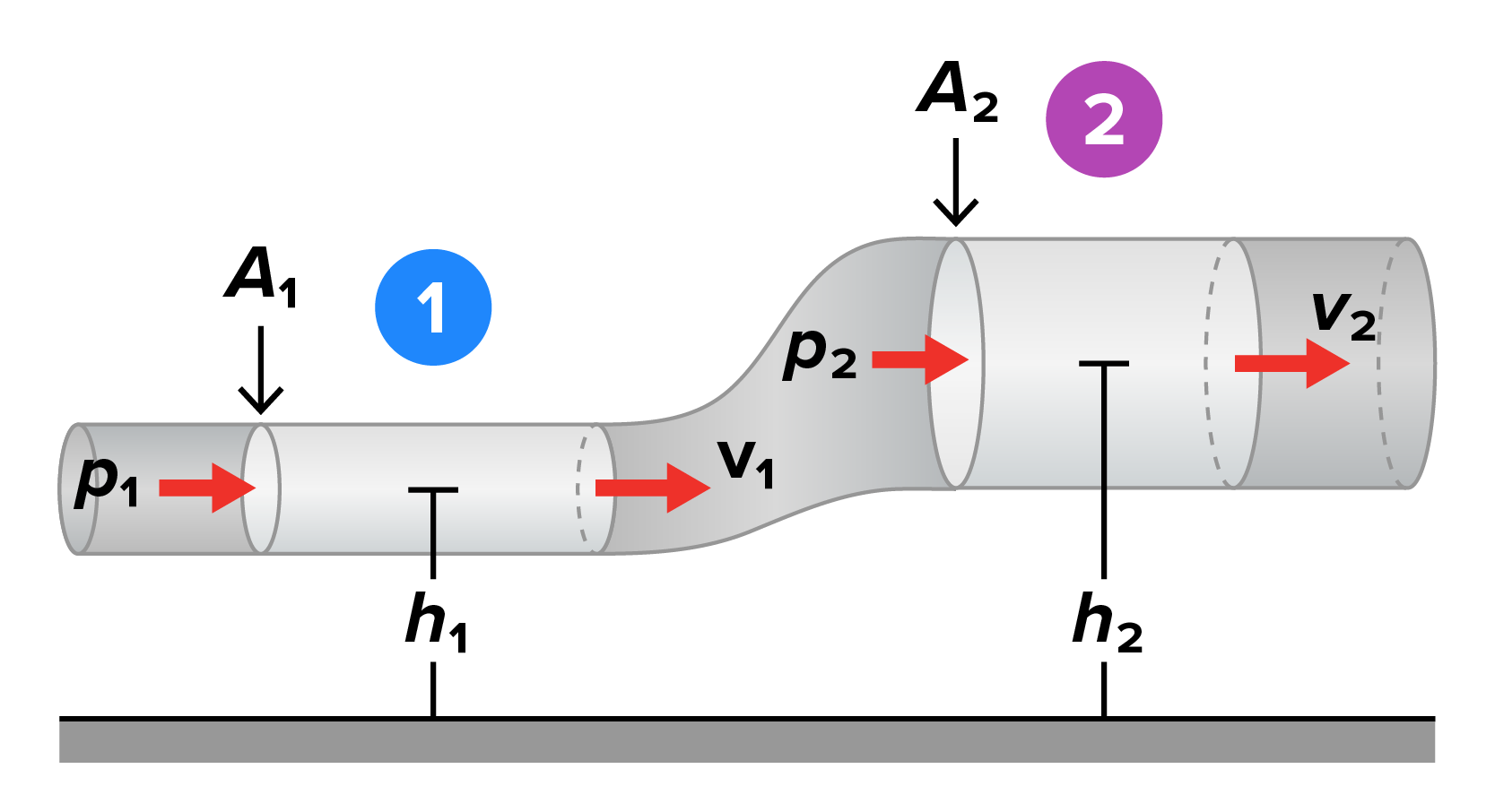 Flow of fluid at two points, 1 and 2. Bernoulli’s Principle connects the energy terms in a flowing fluid—pressure energy, kinetic energy, and potential energy—to the principle of conservation of energy.