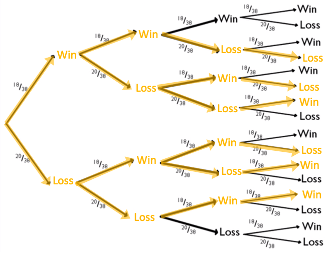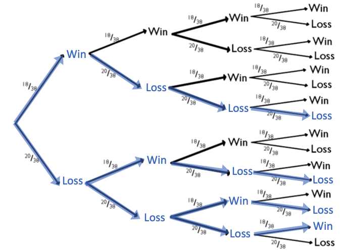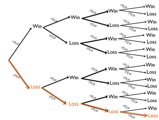 One way to look at this is by following the betting of black on a roulette wheel. Recall that there are 18 black sectors of the total 38 sectors on a roulette wheel.