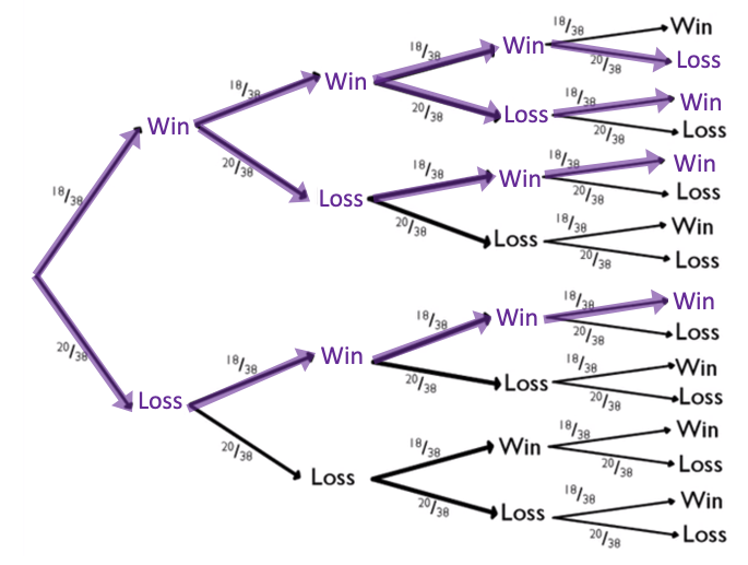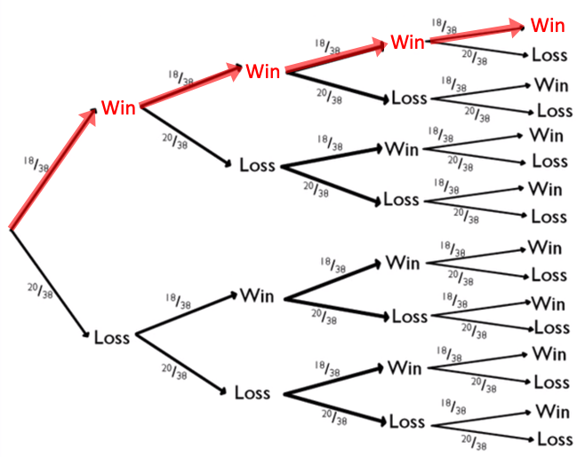 Three wins happened four times. On each of those four branches, 18/38 appeared three times, and 20/38 appeared once. |