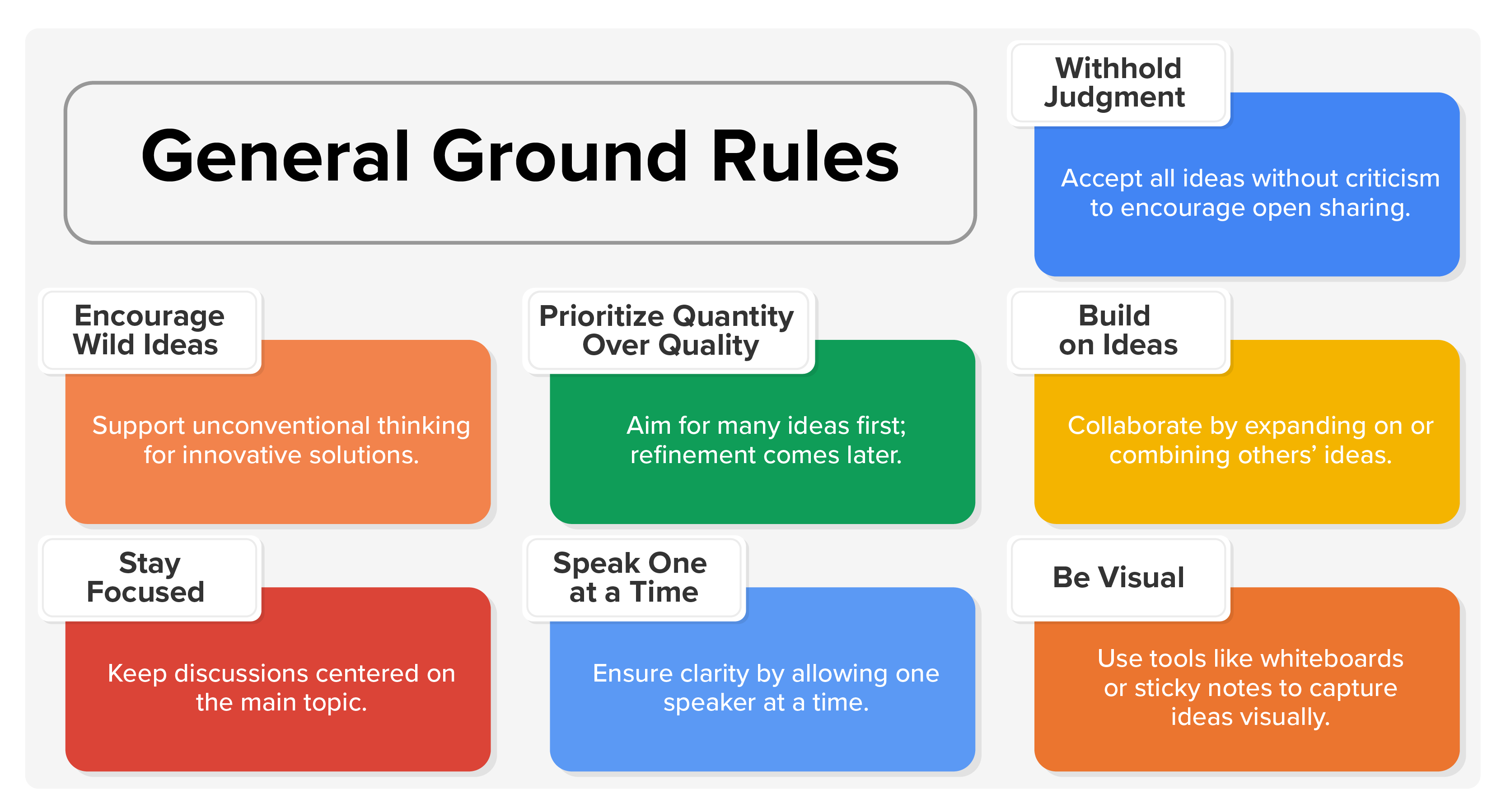 Here are some general ground rules for brainstorming you can adapt to fit your own needs: