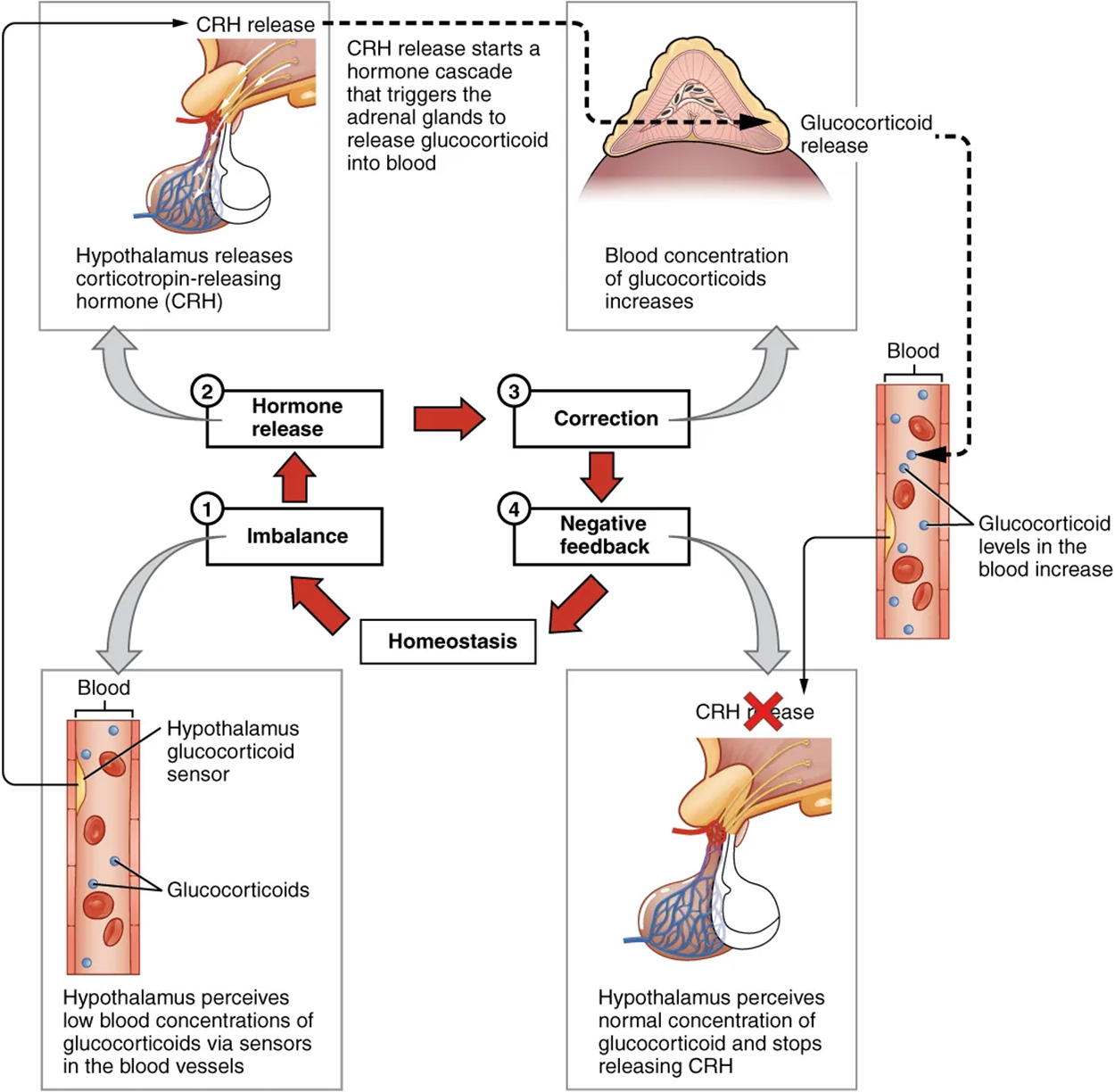 The more common method of hormone regulation is the negative feedback loop. Negative feedback is characterized by the inhibition of further secretion of a hormone in response to adequate levels of that hormone. This allows blood levels of the hormone to be regulated within a narrow range. An example of a negative feedback loop is the release of glucocorticoid hormones from the adrenal glands, as directed by the hypothalamus and pituitary gland. As glucocorticoid concentrations in the blood rise, the hypothalamus and pituitary gland reduce their signaling to the adrenal glands to prevent additional glucocorticoid secretion.