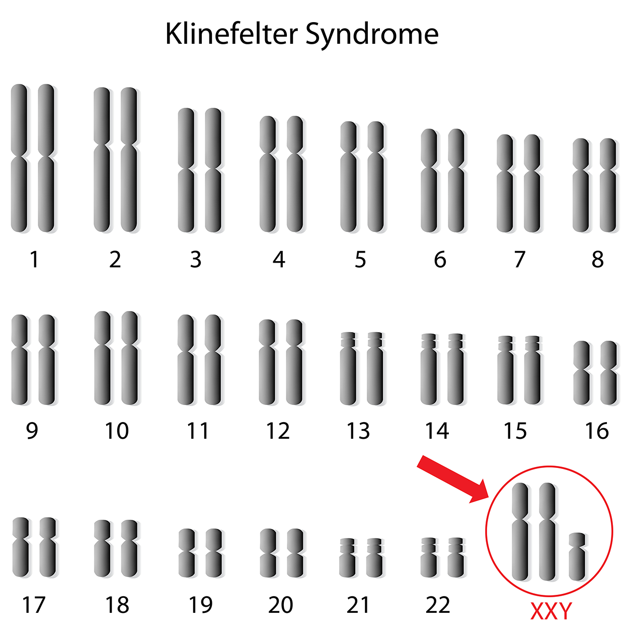 Klinefelter syndrome (XXY) occurs in 1 out of 700 live male births and results when an ovum containing an extra X chromosome is fertilized by a Y sperm. The Y chromosome stimulates the growth of male genitalia, but the additional X chromosome inhibits this development. An individual with Klinefelter syndrome has some breast development, infertility (this is the most common cause of infertility in males), and low levels of testosterone.