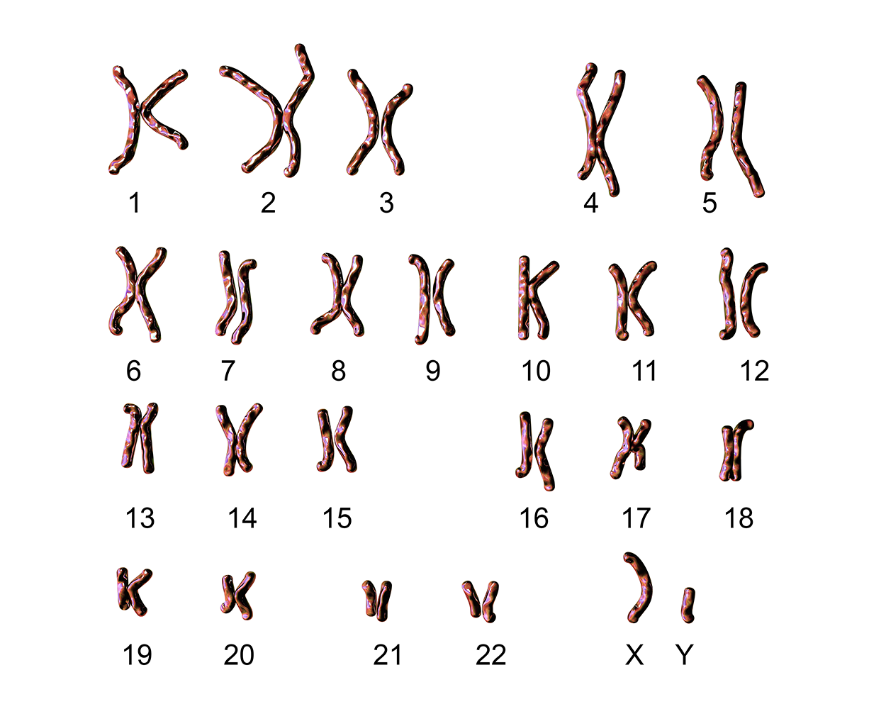 Chromosomes, as you may recall, are long, threadlike structures that are found in a cell’s nucleus and contain genetic information called DNA. Typically, we have 22 pairs of chromosomes and an additional pair of sex chromosomes totaling 46 chromosomes. An image of these chromosomes, called a karyotype, is obtained through a laboratory procedure and helps identify any abnormalities.