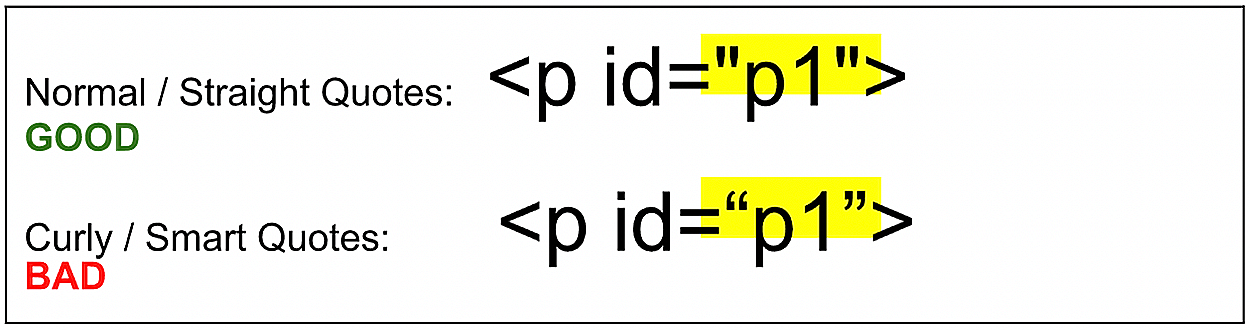 Use caution when copying and pasting code into any code editor as there are different types of quote mark characters, most of which cause problems when used within coding languages like HTML and CSS. If you ever noticed that quote marks in a Microsoft Word document have a slant in the direction of the text that it surrounds, these quotes are called “curly quotes” or “smart quotes” and are not recognized as code. However, if you type a set of quote marks in any code editor, you will notice that the quotes are straight, these are called “straight quotes” or “normal quotes” and are valid characters for coding.