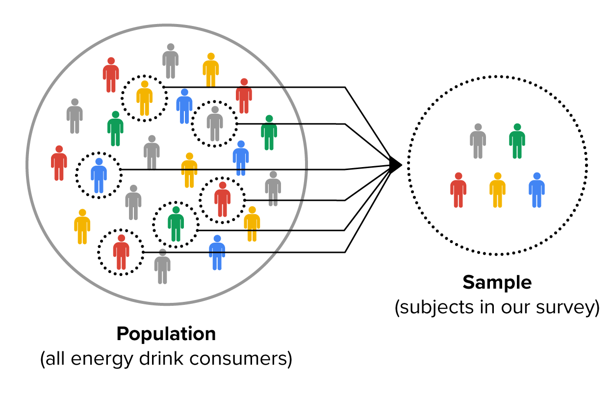 Imagine a company that sells a new type of energy drink and wants to understand how all its potential customers feel about the product. The population in this case would be all potential customers who might buy the energy drink. This population would include all customers within a certain age range, living in a particular region or country, who might be interested in purchasing energy drinks.