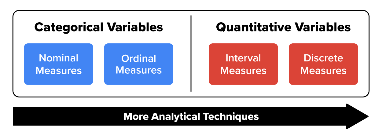 The table below shows the different types of analytical methods that can be used based on the measurement level of the variables. For interval and discrete measurement level data, you have more analytical methods at your disposal.