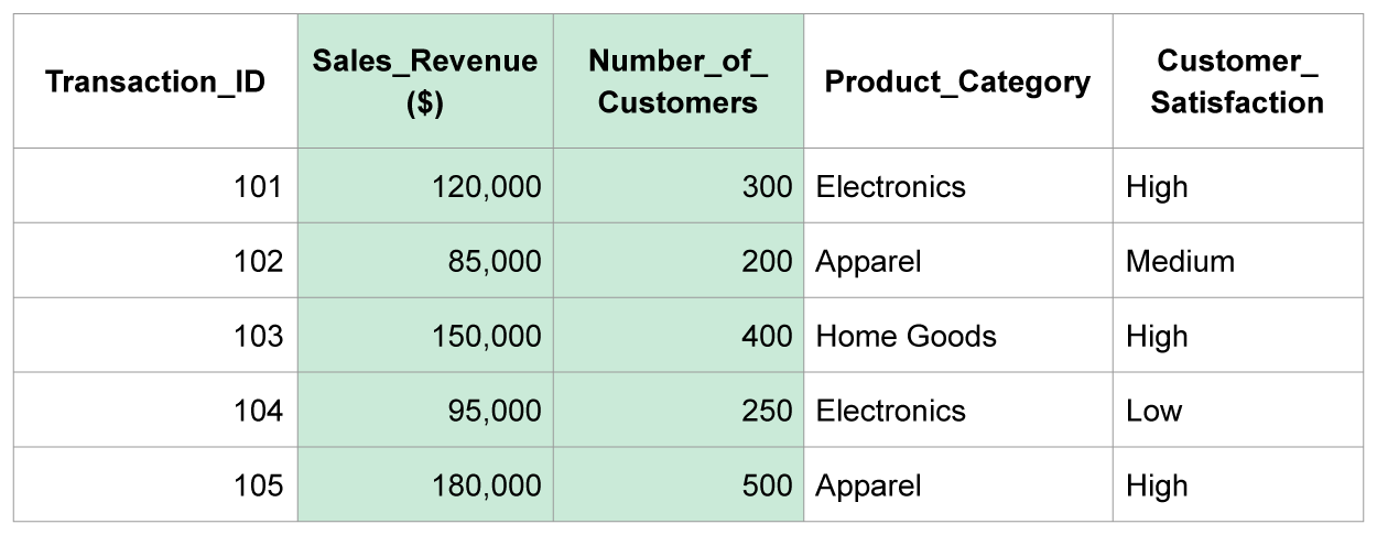 Returning to the retail data shown in the table below, Sales Revenue has a continuous measurement level because sales can take on a value in an interval. For example, the company could have earned $50,000.50. This is a viable value for Sales Revenue. The Number of Customers has a discrete measurement level because the company cannot have 300.5 customers. You cannot viably have half a person. The Number of Customers variable is measured in integers only and cannot take on a value in an interval.