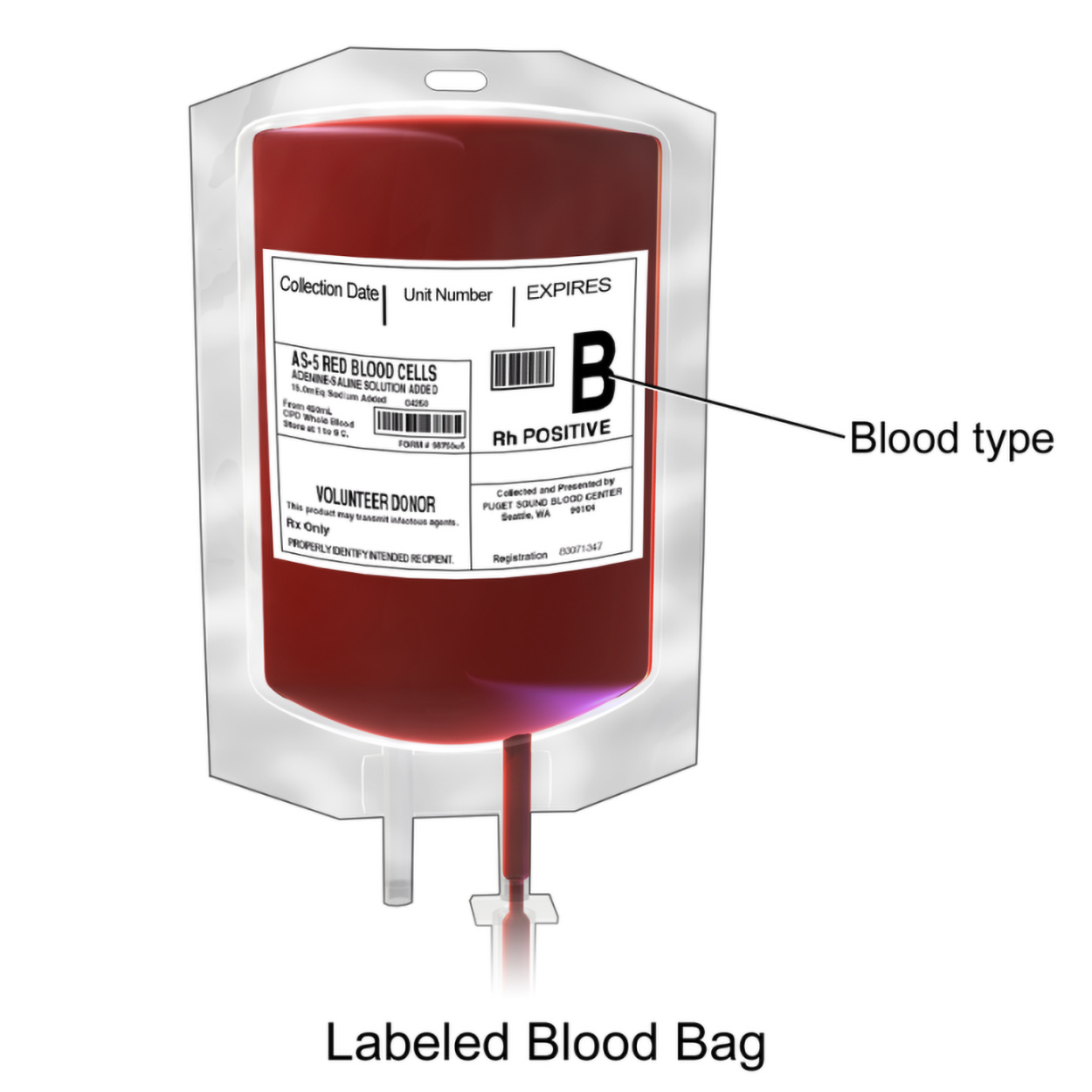 The figure below shows a hanging bag of blood labeled clearly as blood type B. The blood type (i.e., A, B, AB, or O) and the Rh factor positive or negative) are indicated on the label to compare with the patient’s lab results. Health care agencies have strict safety procedures that nurses and other health care personnel follow when providing a blood transfusion to prevent the administration of incompatible blood to a patient.