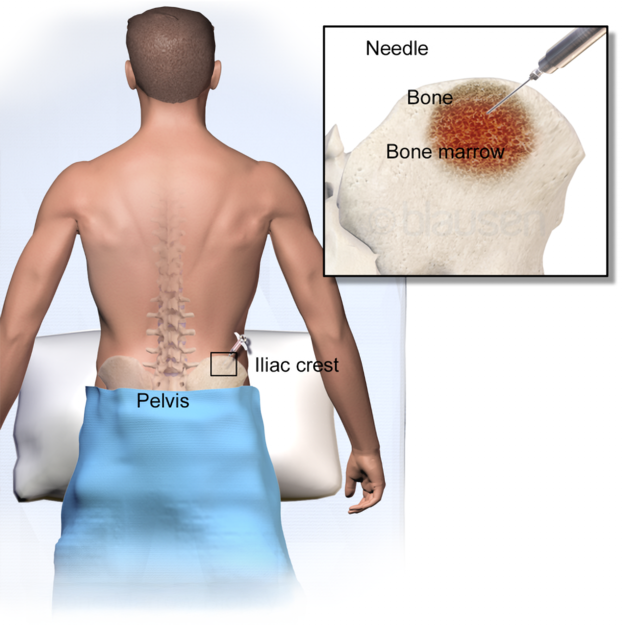 The figure below shows a bone marrow biopsy. A needle is used to take a sample from the hip. A close-up shows that the needle needs to go through the bone to the bone marrow inside.