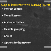 Let's review what we talked about today. Today, we talked about what ways the learning process can be differentiated and what some examples of differentiated learning process are. For more information on how to apply what you learned in this video, please view the additional resources section that accompanies this video presentation. The additional resources section includes hyperlinks useful for applications of the course material, including a brief description of each resource. Thank you for joining me, and happy teaching.