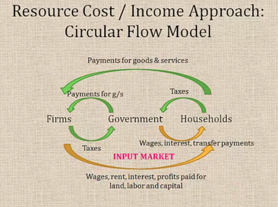Here is a reminder of the circular flow model. Remember, the input market is where are factors of production--land, labor, and capital--are exchanged. The bottom part highlighted in yellow represents the income or resource cost approach in the circular flow model.