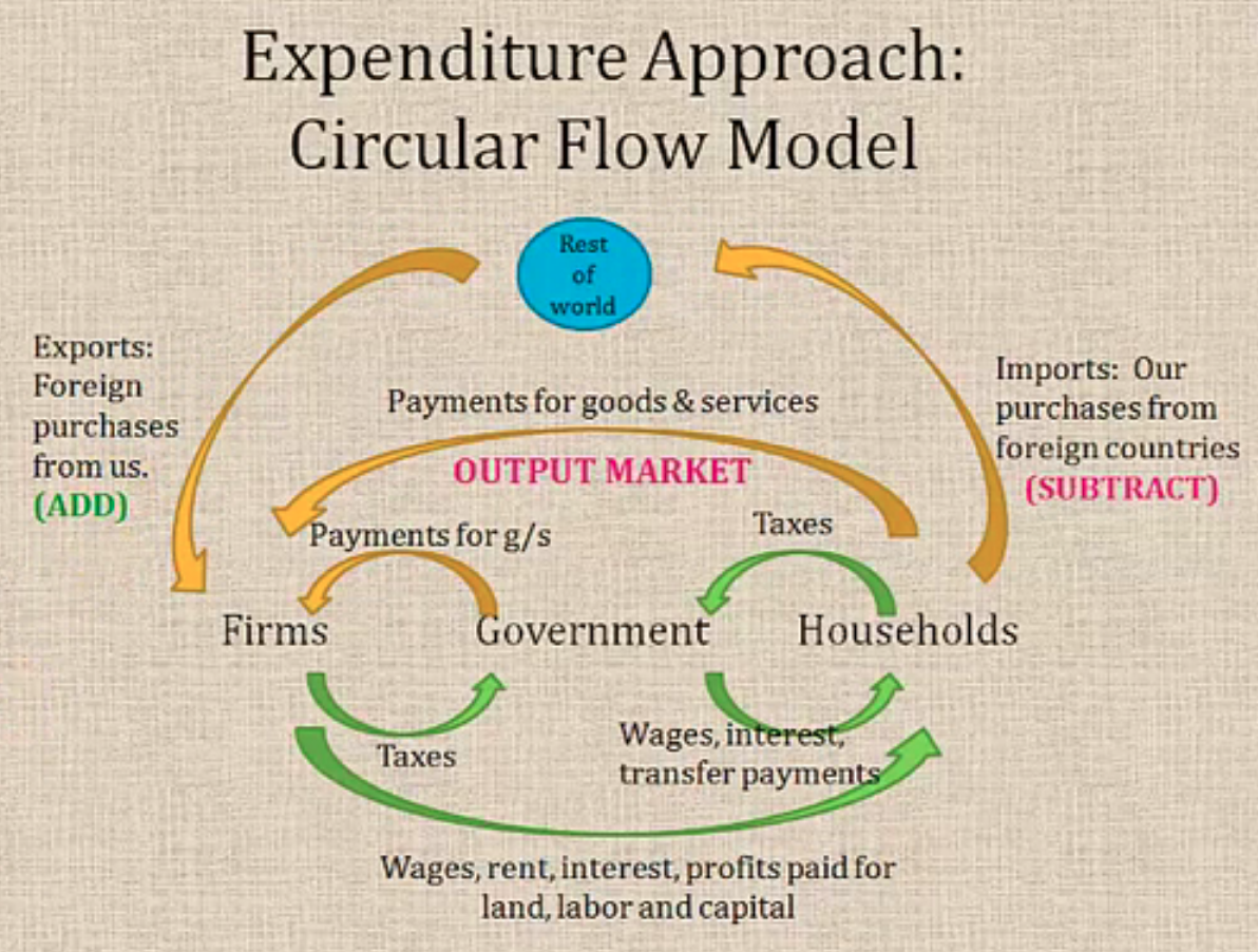 This approach reflects the top of the circular flow model here. As mentioned, we are subtracting what we are importing, or paying the rest of the world for, and adding our exports, because exports are items that we are producing here.