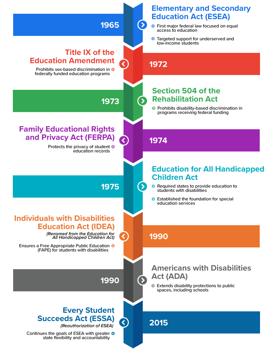 The timeline below highlights major federal education laws that have shaped the United States education system over time. These laws were passed in response to changing social needs, civil rights movements, and growing awareness of the importance of equal access to education. When viewed together, they show how the federal government’s role in education has expanded to protect students’ rights and promote fairness in schools.