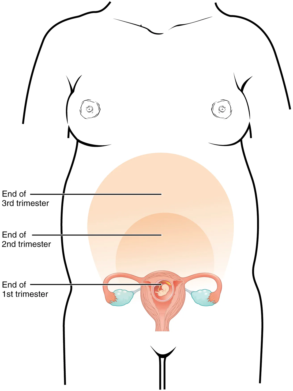 During the second and third trimesters, the pre-pregnancy uterus—about the size of a fist—grows dramatically to contain the fetus, causing a number of anatomical changes in the pregnant person.