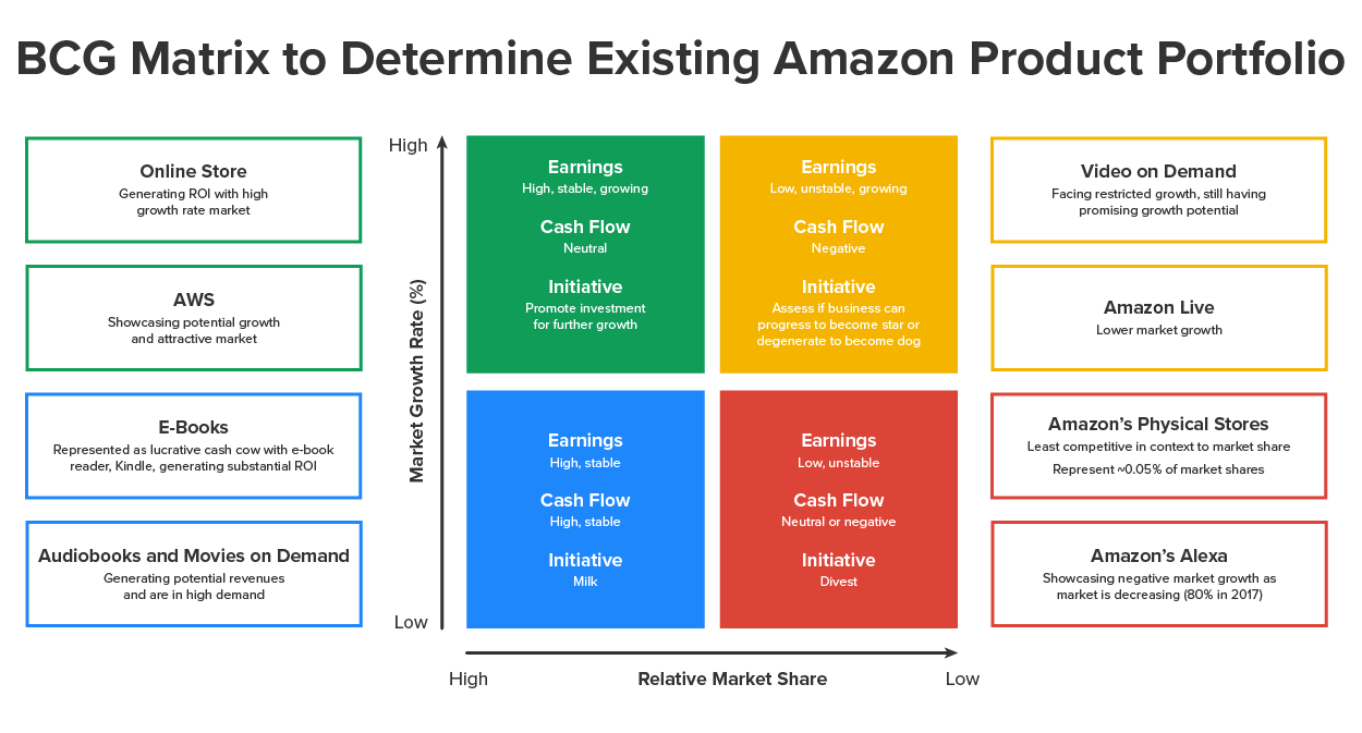 The image below shows an example of using the BCG matrix to evaluate Amazon’s product portfolio. Using this matrix, Amazon should invest the most in its online store and Amazon Web Services (AWS). It should also invest in its video-on-demand and Amazon Live services to capture more growth in this market, which shows significant potential. Amazon should continue to reinvest its revenues from e-books, audiobooks, and movies on demand in its online store, AWS, video on demand, and Amazon Live. When its e-books, audiobooks, and movies on demand no longer return a profit, Amazon should discontinue these services. Amazon should work to reposition its physical stores and Alexa to increase profits or evaluate the next steps to divest in these categories.