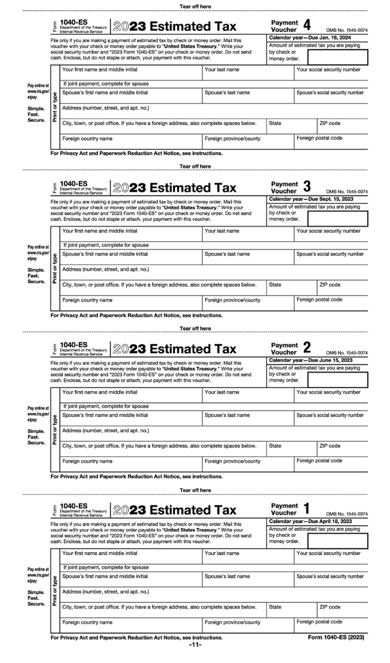 Form 1040-ES also contains blank vouchers that can be used when a taxpayer mails their estimated tax payments. Payments can also be made electronically using the Electronic Federal Tax Payment System (EFTPS).