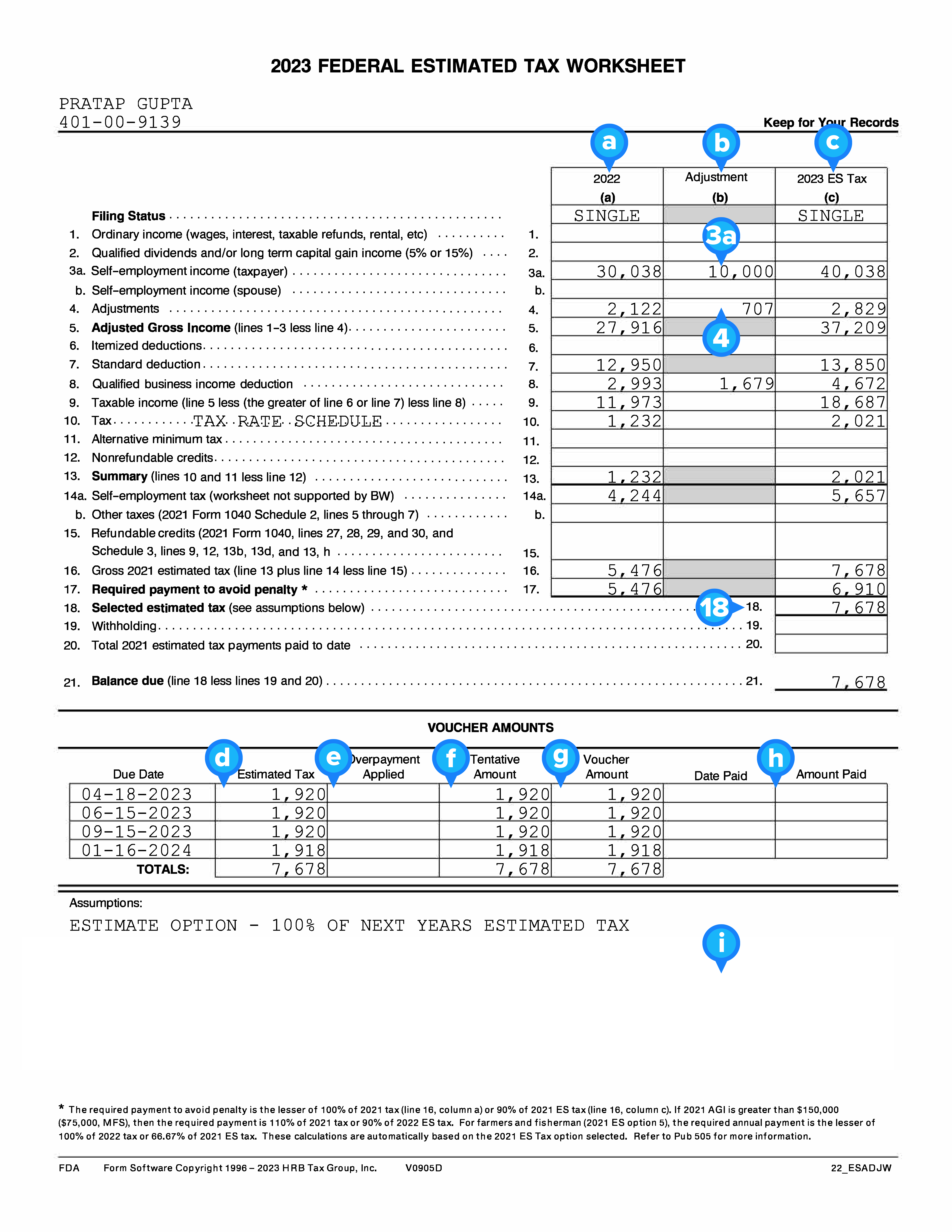 Pratap Gupta from Exercise 12.6 would like help with his 2023 estimated tax payments. He feels everything will basically be the same in 2023 as it was in 2022, other than an increase in business profits of $10,000.