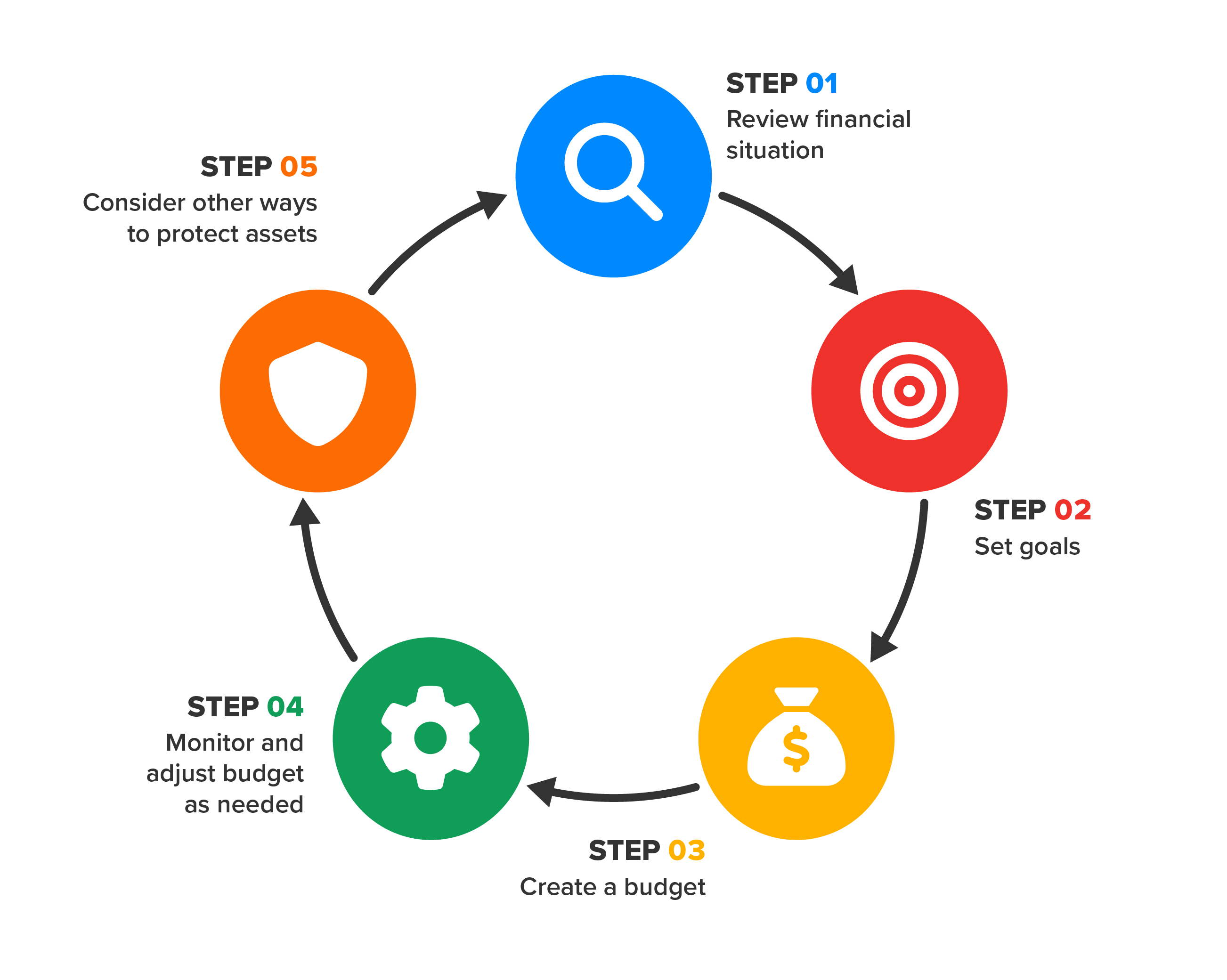 The first step is to assess your current financial situation by reviewing your income, expenses, assets, and liabilities. This gives you a clear picture of your net worth and cash flow. Net worth is the value of all of your assets minus your liabilities (the money you owe). Once you understand where you stand financially, the next step is to set financial goals.