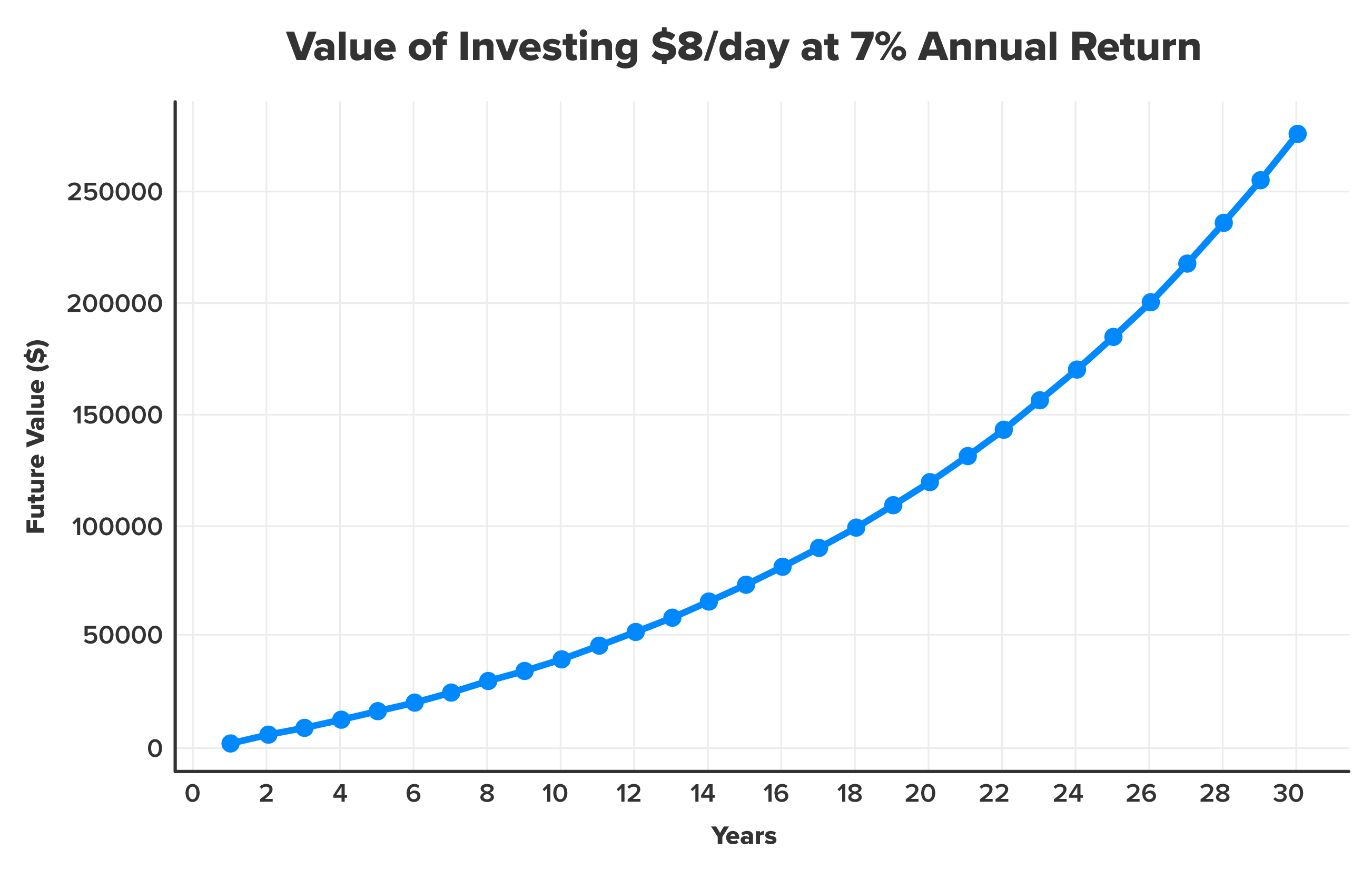 - In 30 years, that amount would be $240,000.