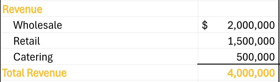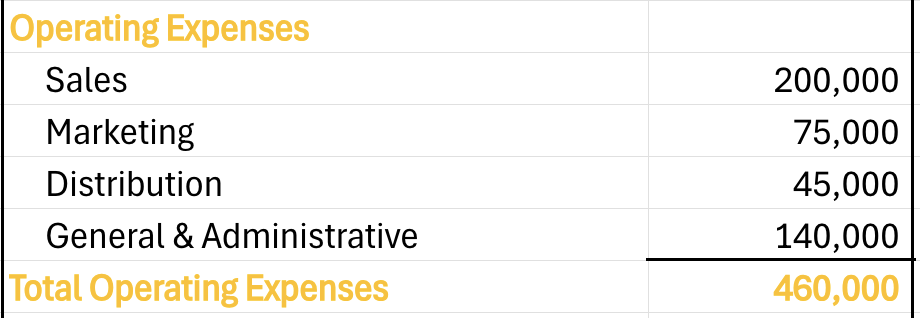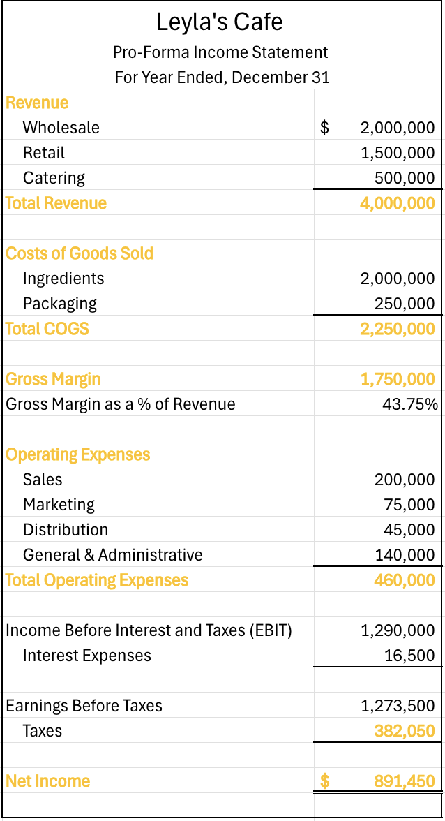 Next, an estimate must be made for selling, general, and administrative expenses or SGA. These costs can include combined payroll costs and the major portion of non-production-related costs. We also deduct depreciation and amortization on fixed assets, along with research and development costs. Leyla’s cafe does not have any depreciation or amortization, but she does have expenses for sales, marketing distribution, and general and administrative items.