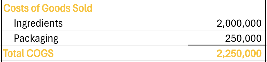 The next item to be forecast is the cost of goods sold or COGS. This is the inventory cost of the goods that a business has sold. It includes all costs to purchase and convert inventory to sell. If a business sells physical goods, other costs like freight, labor, and allocated overhead may be incurred. Leyla has two line items in her cost of goods sold section: ingredients and packaging.