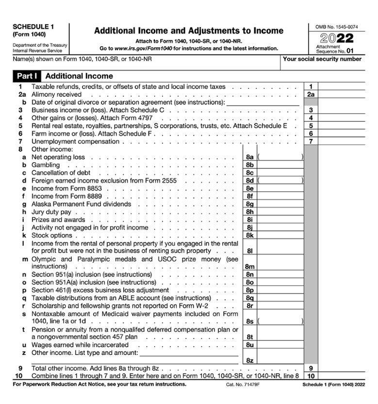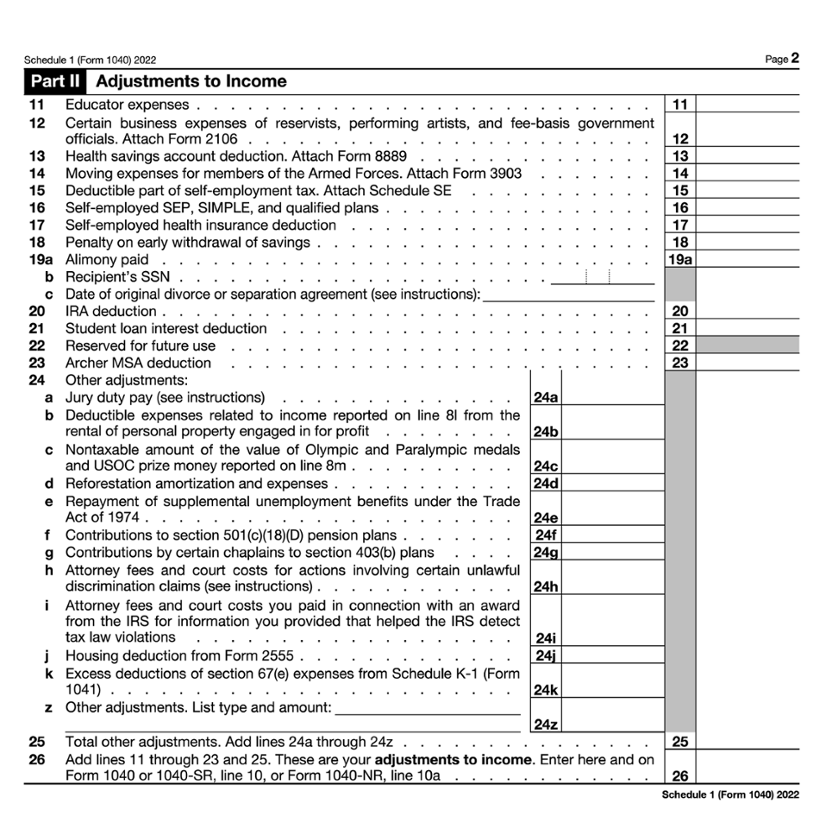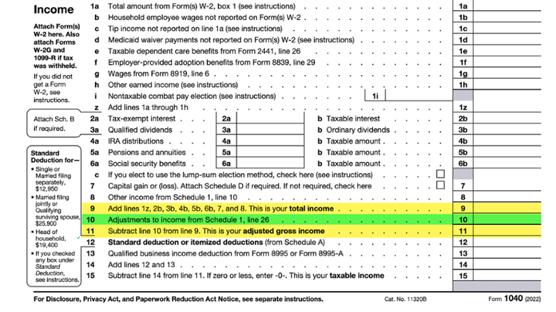 The adjustments to income are entered on Schedule 1 (Form 1040) and subtotaled. The total on line 26 is entered on Form 1040, line 10, and then subtracted from Form 1040, line 9. The result is the taxpayer’s adjusted gross income on Form 1040, line 11.
