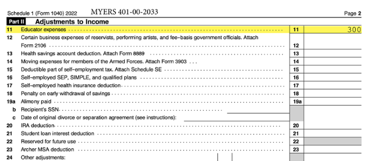 Rita Myers is a fourth-grade teacher. She taught full time during the entire school year. During 2022, she spent $625 on teaching supplies used in her classroom. She did not receive any reimbursements. Rita may deduct $300 of these expenses on Schedule 1, line 11, as an adjustment to income.