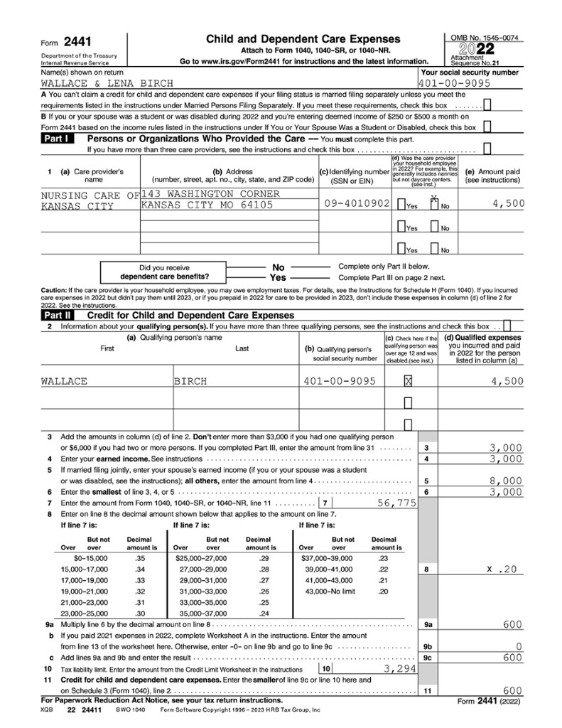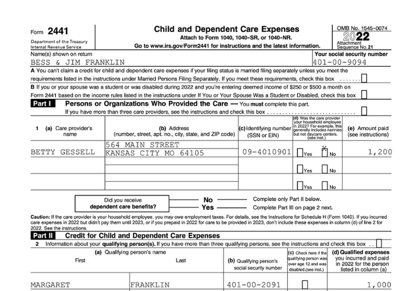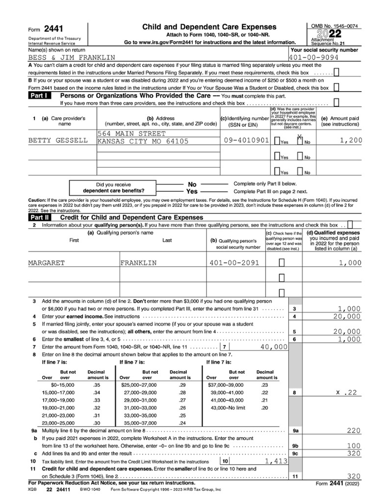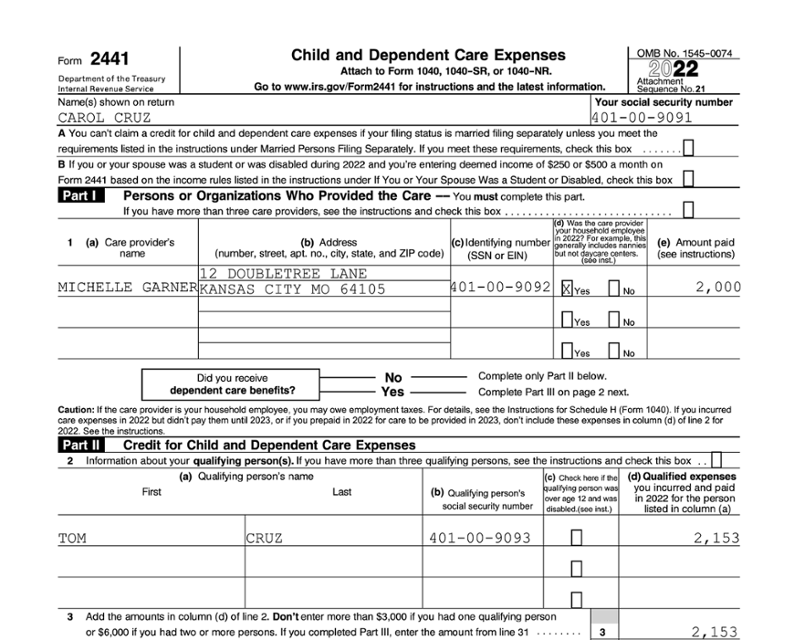 Jon (3) and Fred (12) are each a qualifying child dependent for their parents, Mark and Susan. Mark and Susan paid $7,500 in child care expenses for Jon. They incurred no child care expenses for Fred. Because Jon and Fred are both qualifying persons for purposes of the credit, Mark and Susan’s Child and Dependent Care Credit for 2022 will be based on $12,000.The lines on Form 2441, Child and Dependent Care Expenses, are, for the most part, self-explanatory. Those that require a bit of added explanation are discussed below.