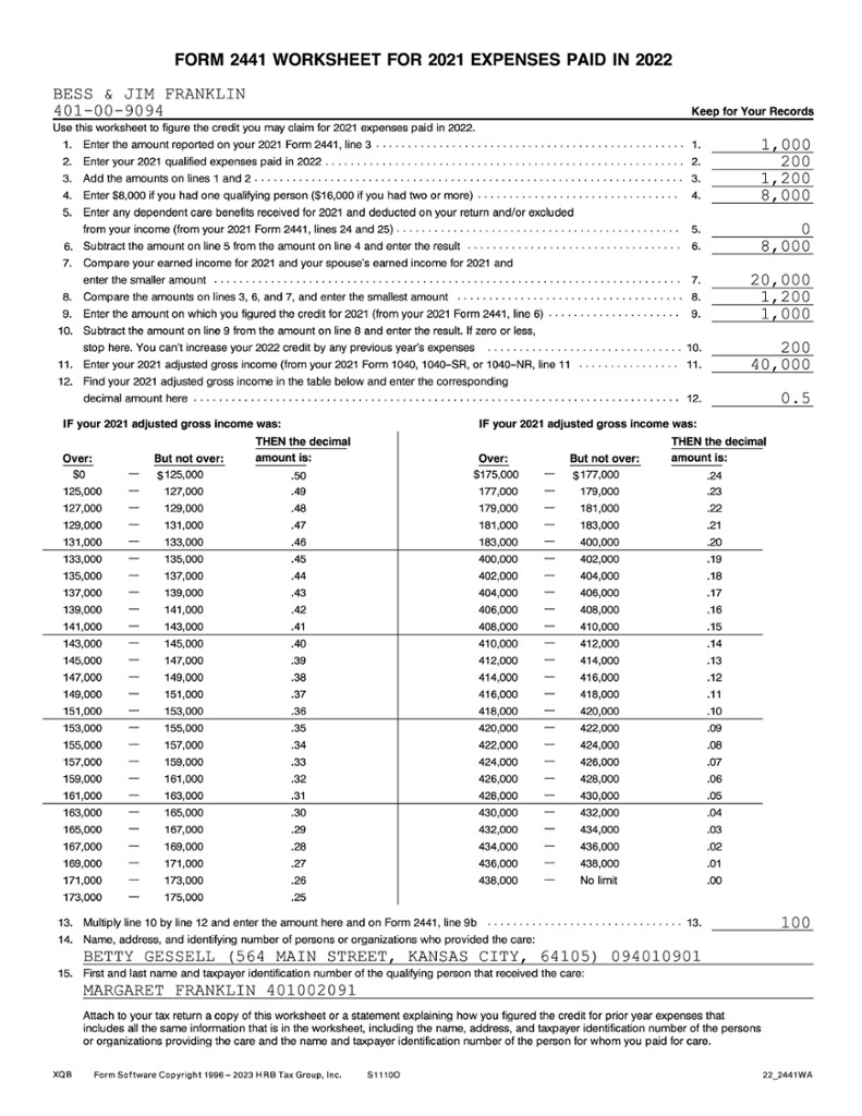 If the taxpayer paid qualified expenses in 2022 that were incurred in 2021, they must figure that portion of the credit using Worksheet A, Worksheet for 2021 Expenses Paid in 2022, in the 2022 Instructions for Form 2441, or a similar worksheet.