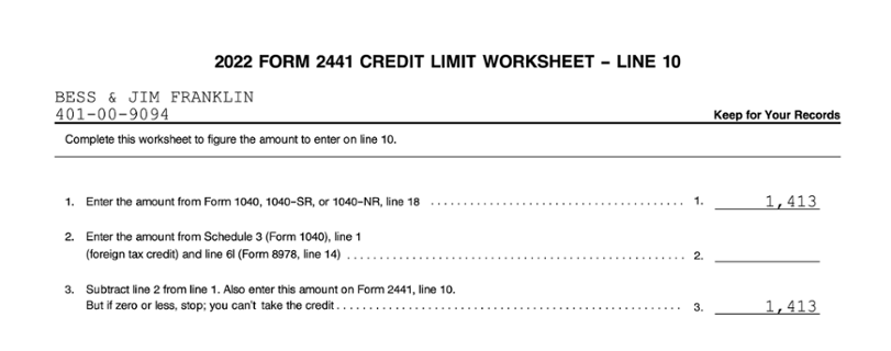 The taxpayer's Child and Dependent Care Credit is a nonrefundable credit that is limited to the taxpayer's tax liability, and any excess is lost. The credit limitation is completed by using the 2022 Form 2441 Credit Limit Worksheet – Line 10 worksheet.