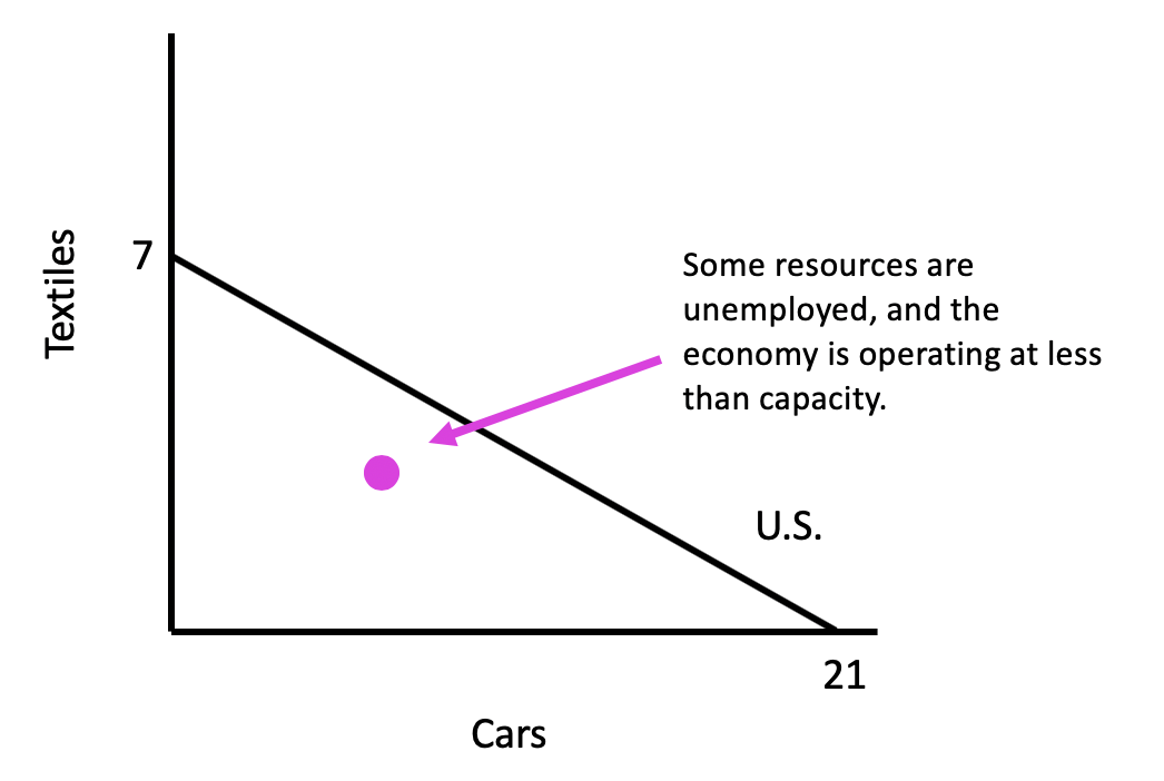 For every one textile that the United States decides to produce, it gives up the ability to produce three cars. Why does it give up three cars? Because we are assuming that resources are fully utilized and fully employed, so if it wants to produce one more textile, it will need to take resources out of cars and put them into textiles.However, what if the United States were in a recession? This would be represented by a production level somewhere inside the curve where it is not actually producing a maximum combination.