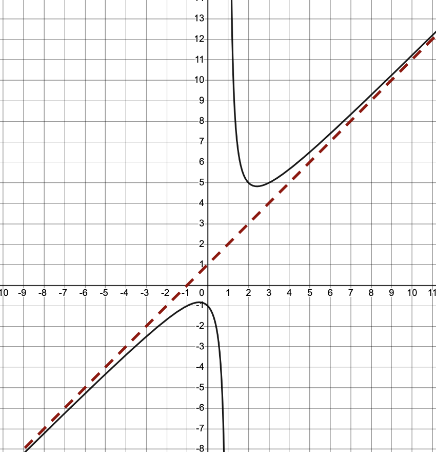 With horizontal asymptotes, we considered either when the degrees of the polynomials in the numerator and denominator are equal, or if the degree in the denominator is greater. If the degree in the numerator is one greater, then the rational function has an oblique (or slant) asymptote. When this happens, the equation for the oblique asymptote is
